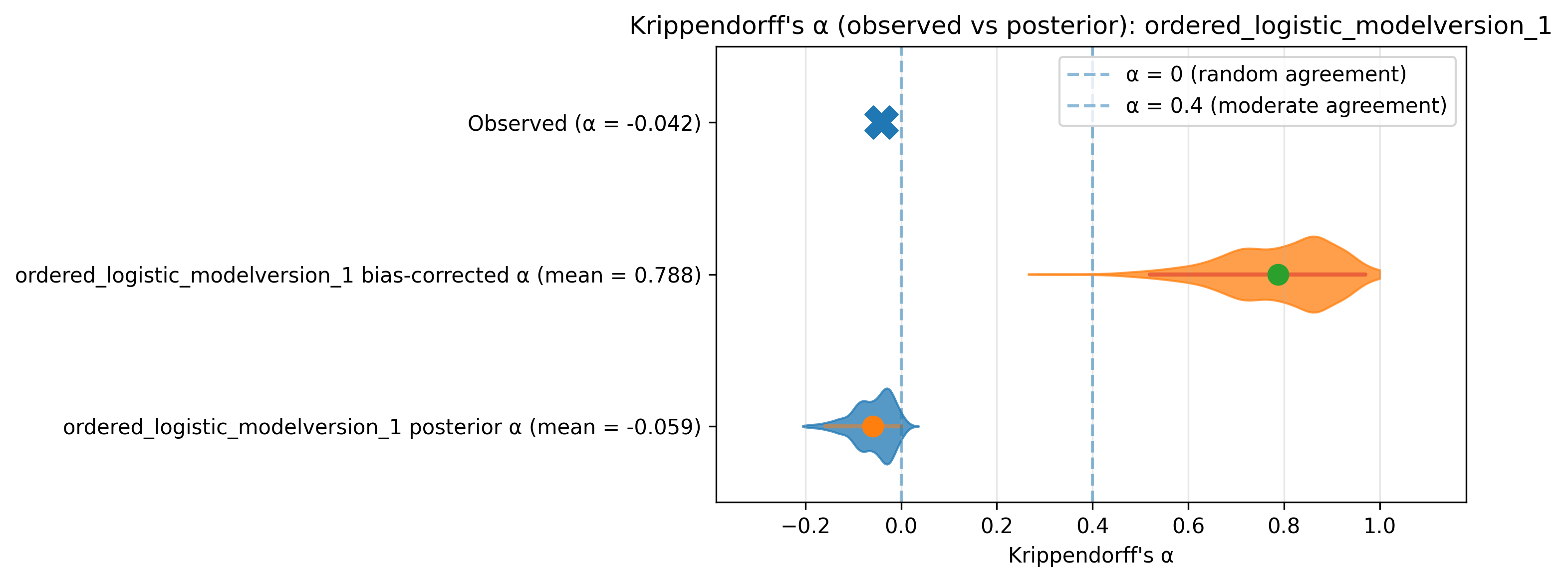 To what extent do graders agree with one another? We can calculate Krippendorff’s alpha over simulated scores by sampling from the fitted GLM. This sounds quite complicated but can be easily implemented as a communicator!