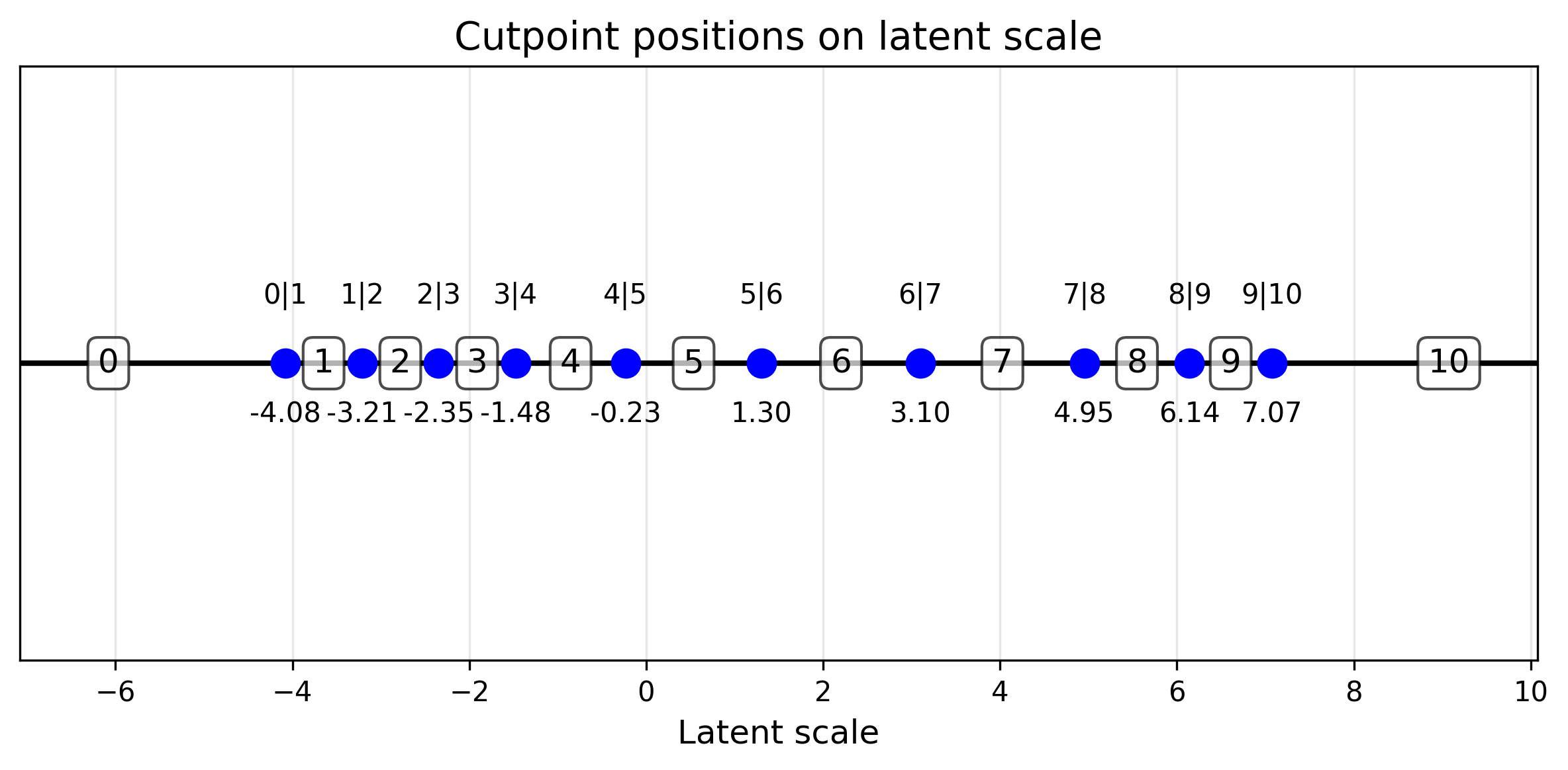 As each item awarded a score between 0 and 10, need need to use a special likelihood function. Good news HiBayES already supports this with the ordered_logistic_model model.
