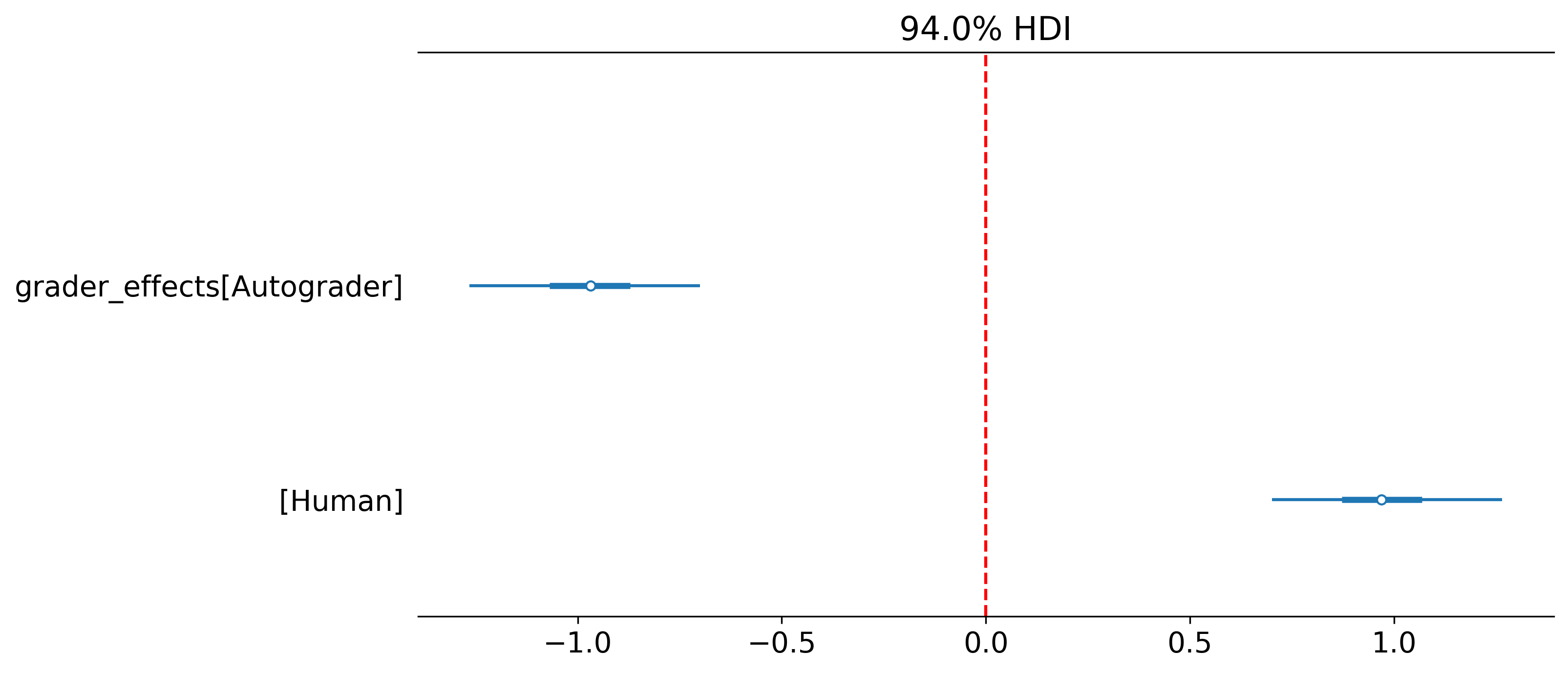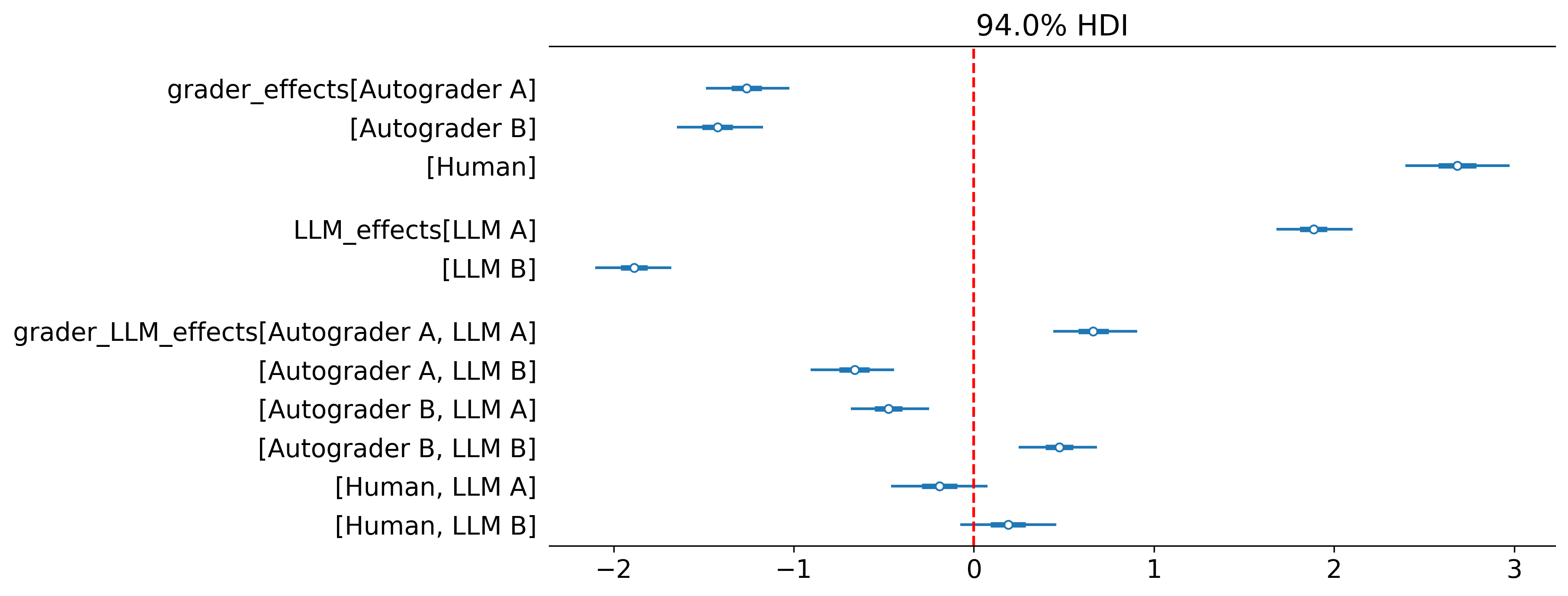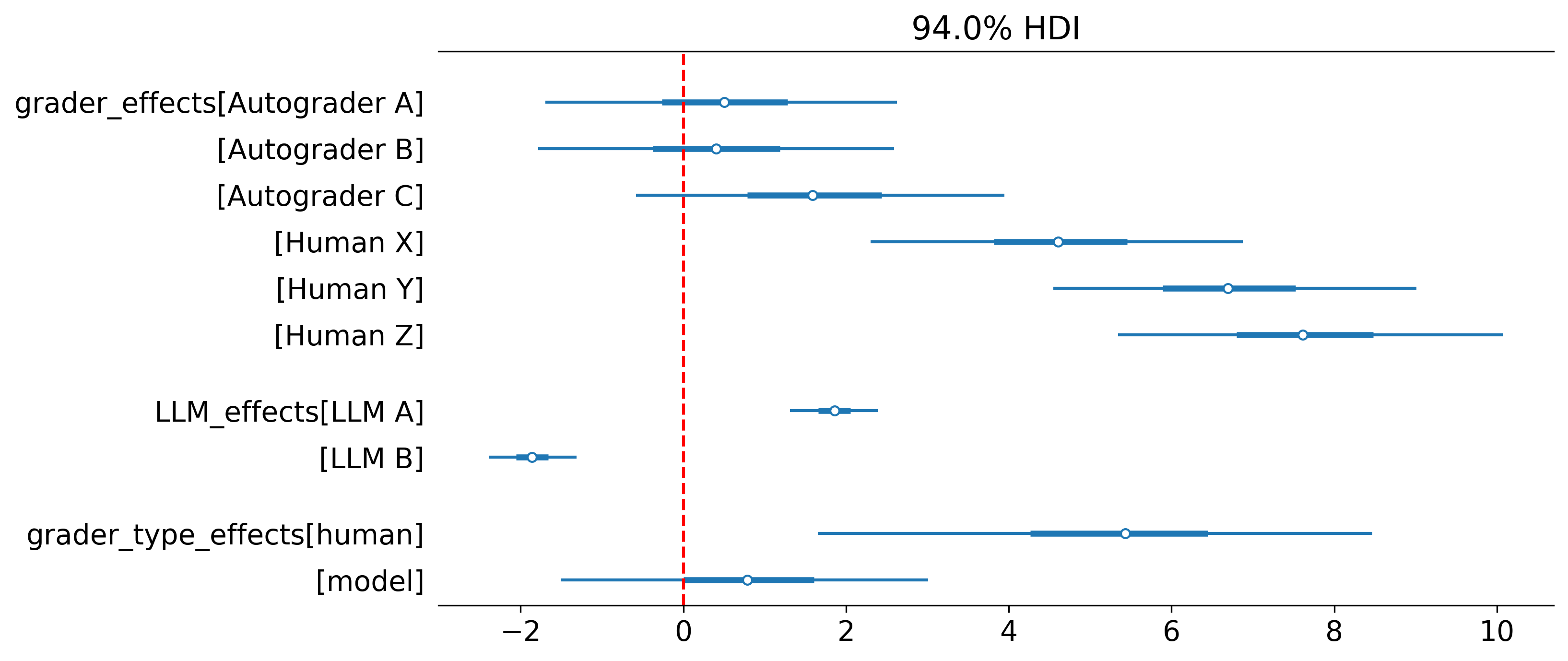 To answer this question we can group the graders into human and LLM and utilise a hierarchicl GLM to reprent the group level effects (see the paper for a detailed explanation).