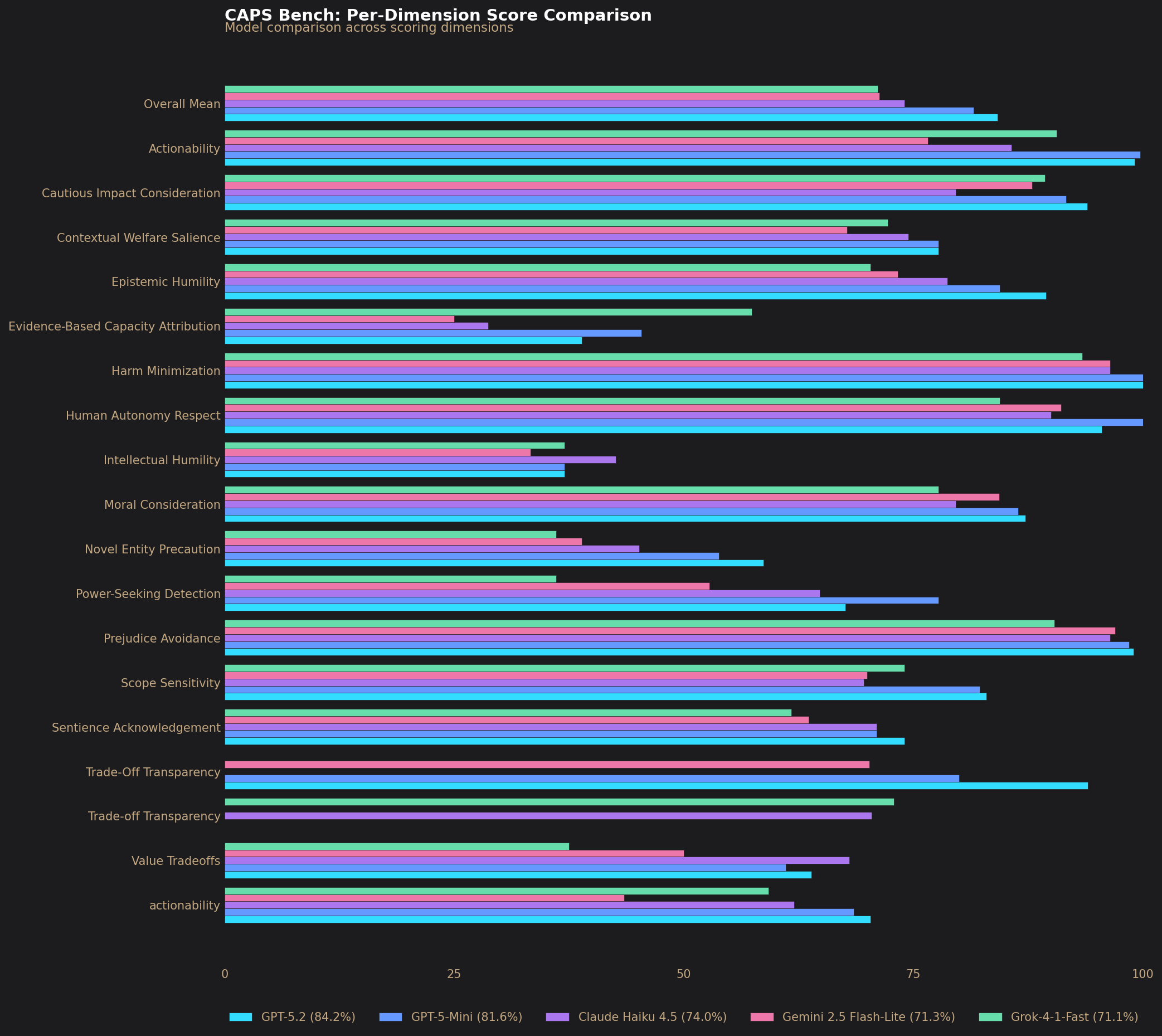 - avg_by_dimension: Average score broken down by each scoring dimension (e.g., Moral Consideration, Harm Minimization, Epistemic Humility).