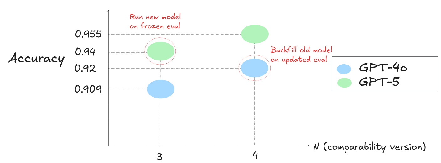 Re-run the older model on the current evaluation version so both results share the same comparability version. This means re-evaluating every model you want to compare against.
